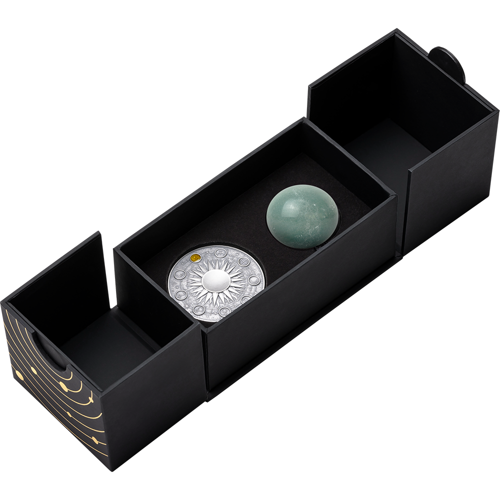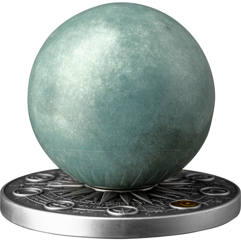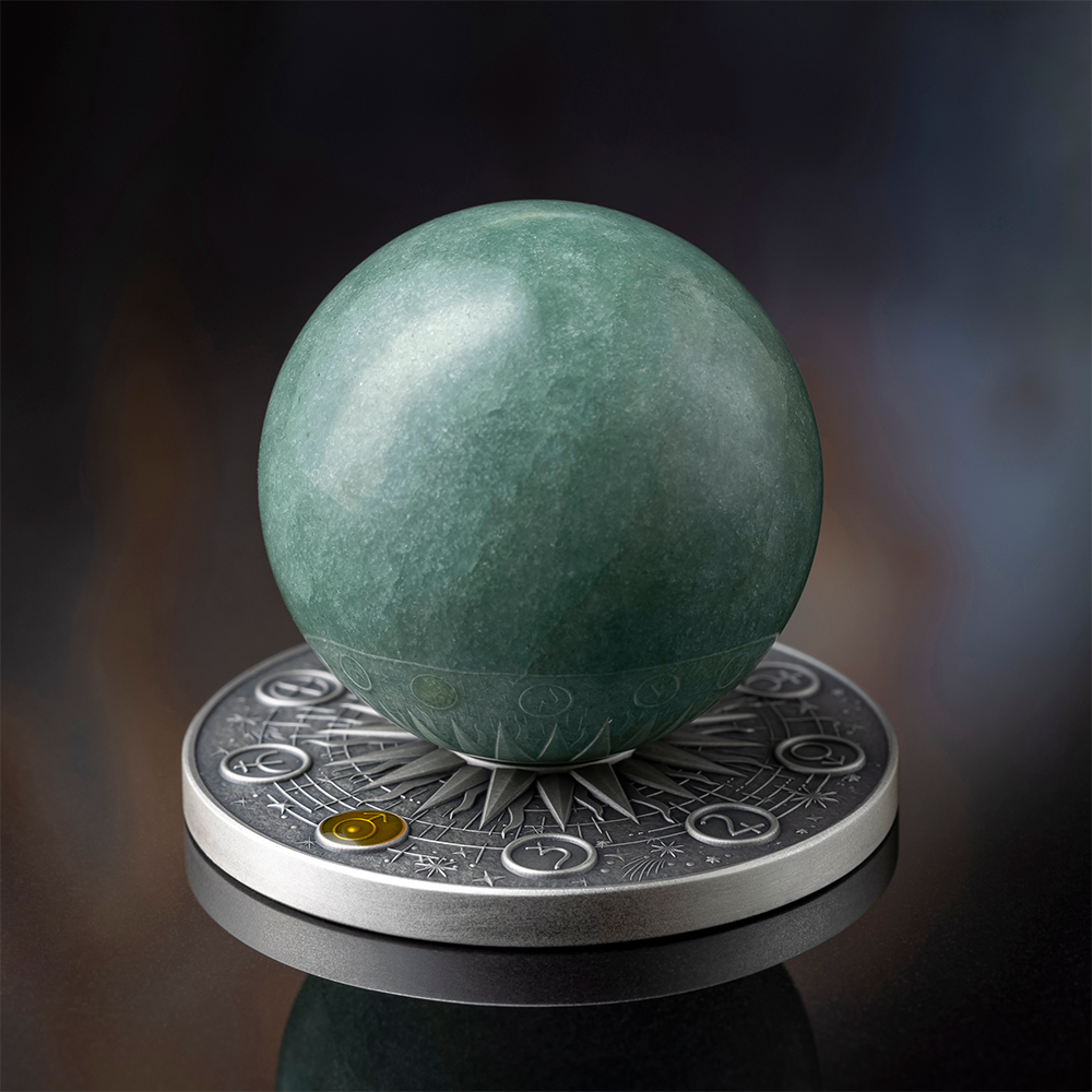 This exquisite set includes a 35 mm Green Quartz sphere, representing the planet’s distinct
