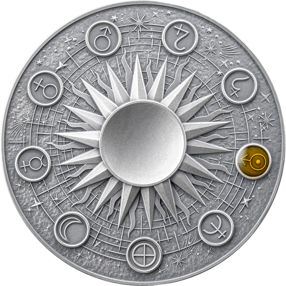 bluish tint, and a beautifully crafted 2-ounce high-relief coin. Together, they capture Uranus’s