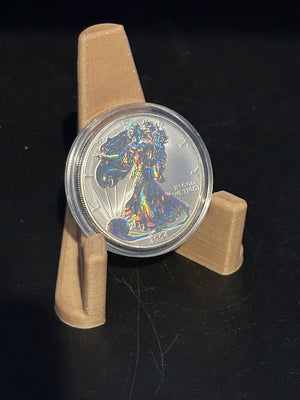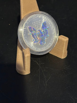 Add a unique touch to your coin collection with the American Silver Eagle Holographic coin with a random year. The holographic liberty design adds an eye-catching element to this 1oz .999 silver coin. Make a statement with its mesmerizing ice blue refraction!