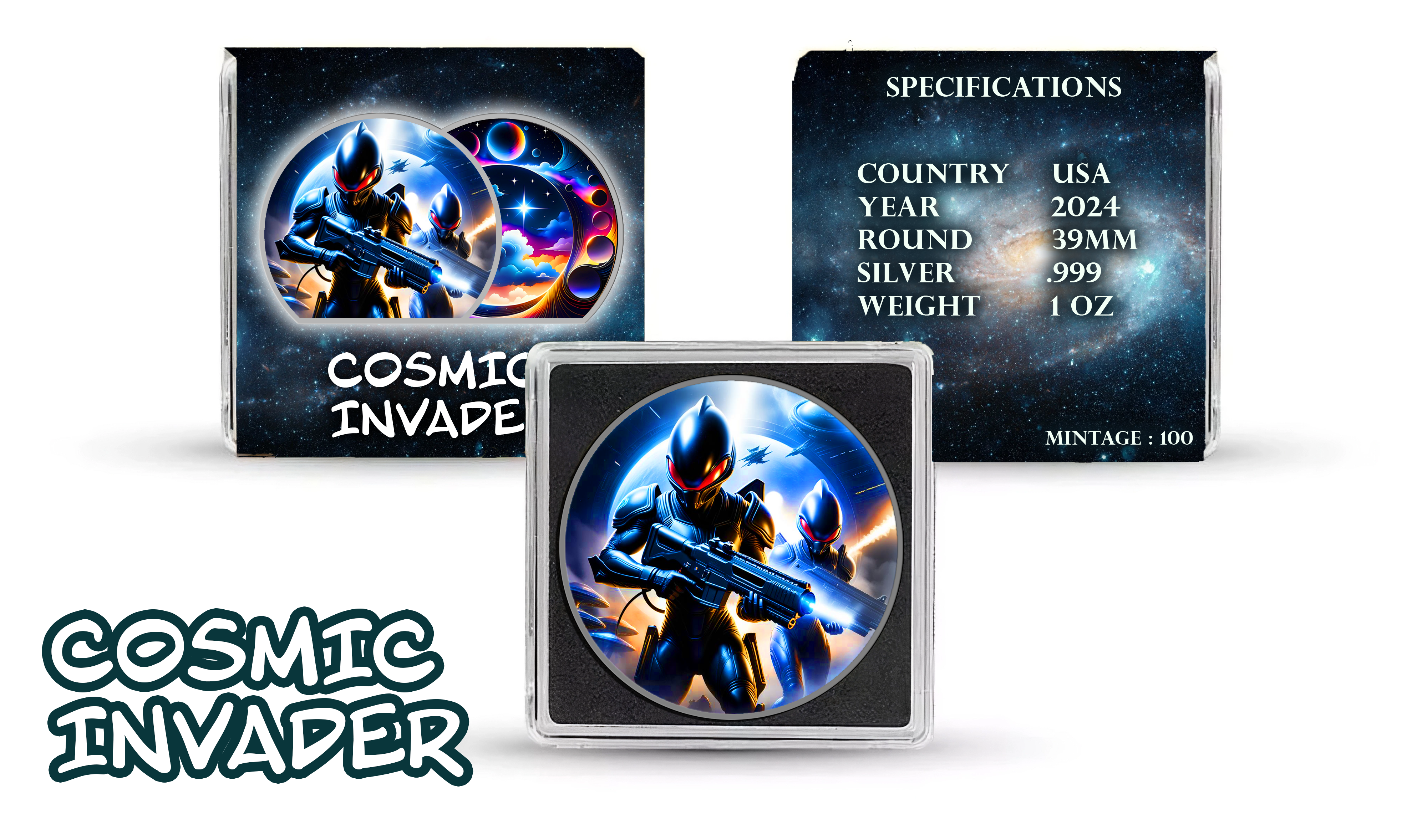 The 2024 Samoa "Cosmic Invaders" Alien Battle Color Proof-like coin is a stunning addition to any collection. Struck in 1 oz of .999 silver with a diameter of 39mm, this coin showcases a vivid, futuristic design featuring two armored soldiers ready for battle against a mesmerizing cosmic backdrop of planets and stars. With an ultra-limited mintage of only 100 pieces, this collectible is as rare as it is visually striking. Presented in a space-themed protective case, it also includes detailed specifications like the year (2024) and country (USA).
