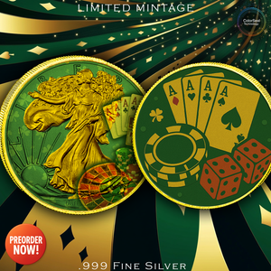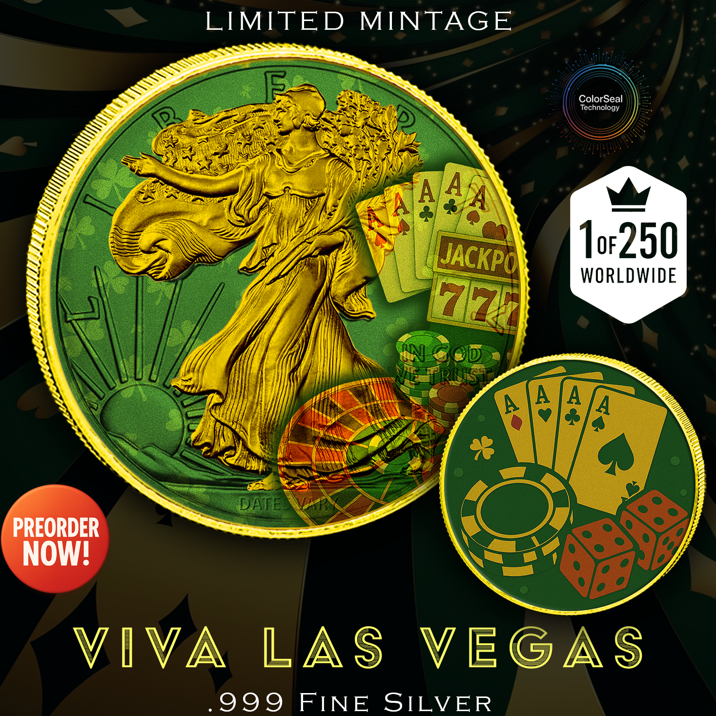 The 2024 Silver Eagle Viva Las Vegas silver coin boasts 250 PIECES, including a stunning gold gilded design and motifs of gambling and night lights. Indulge in the glitz and glamour of Sin City with this 1oz .999 pure silver coin.