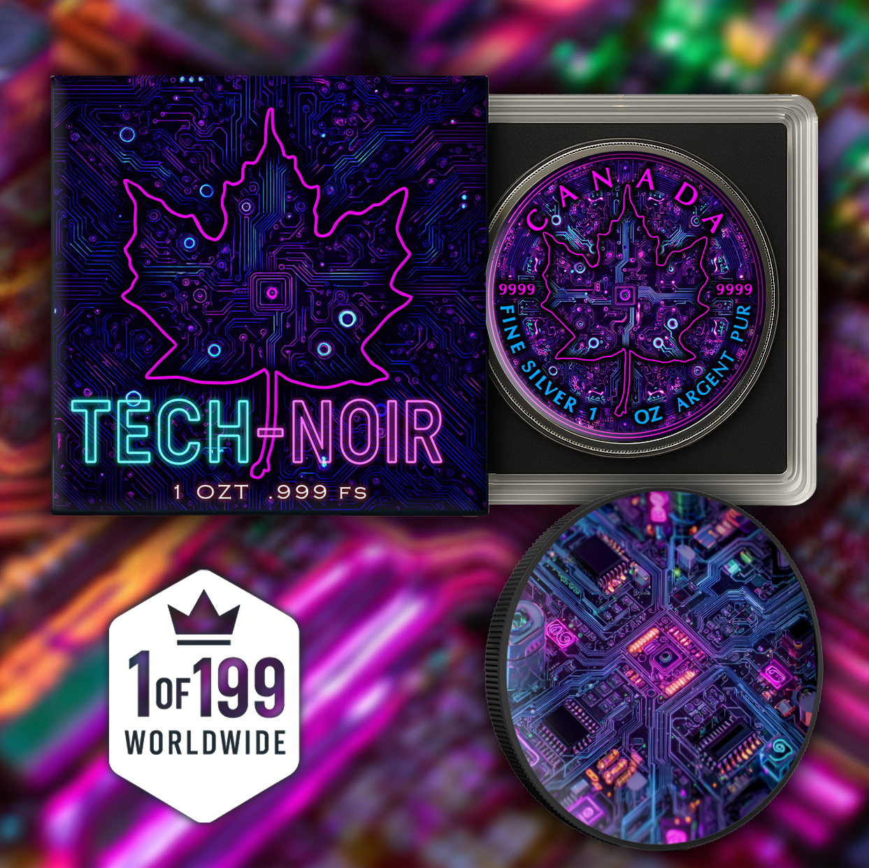 This 1oz silver coin blends iconic Canadian heritage with a striking cyberpunk aesthetic, limited to just 199 pieces worldwide. Its vivid colorization and Tech Noir design make it a standout addition for any collector seeking rarity and cutting-edge style.
