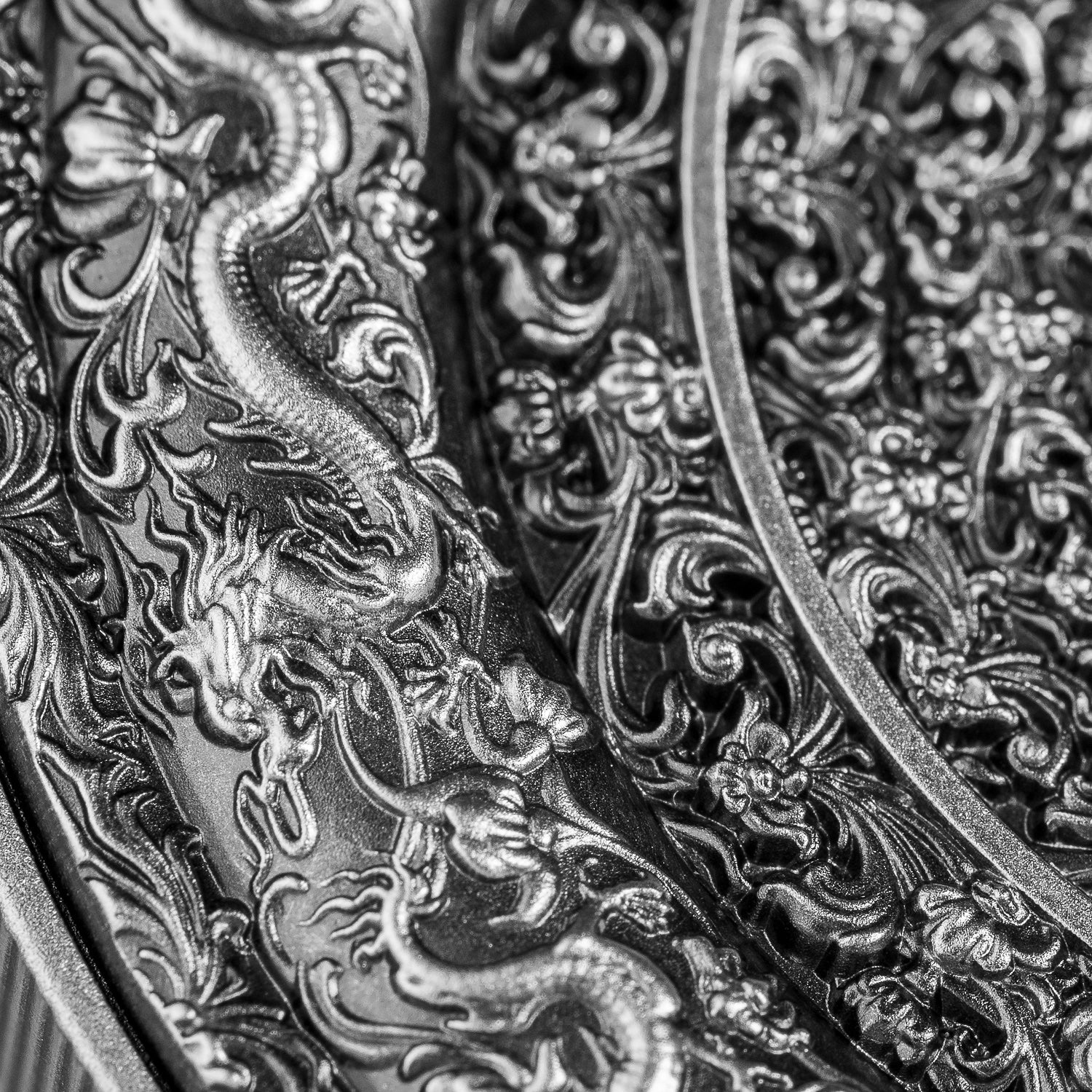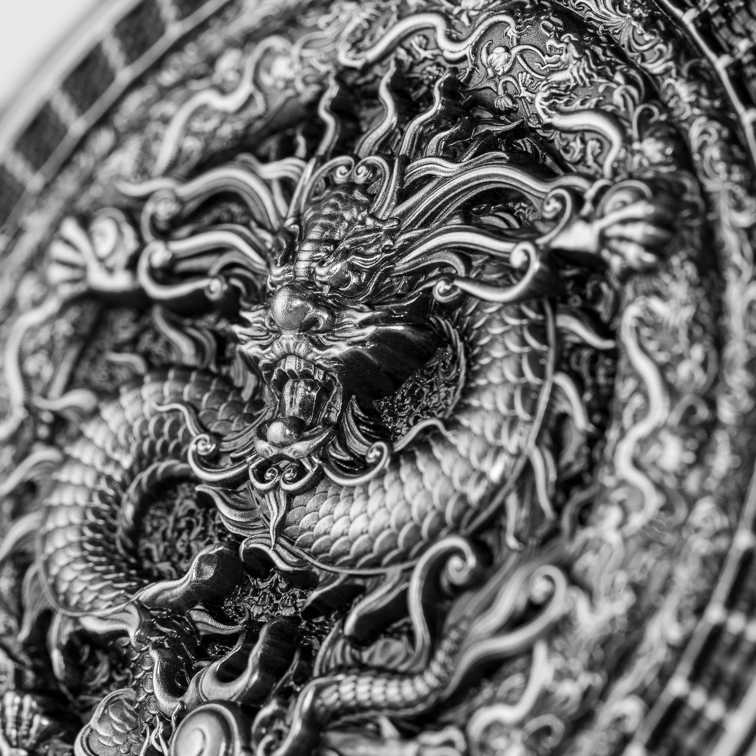 At 60mm diameter, this piece is double the size of a regular 1 oz collectible, giving it an incredible weight and feel that complements the regal Chinese Dragon. This is made possible with a new minting technique called “Bi-Metal Plus”, which combines 4.5 oz of copper embodied within two layers of 999 fine silver totaling 1 oz, to deliver a super ultra-high relief topped with silver antiqued finishing.