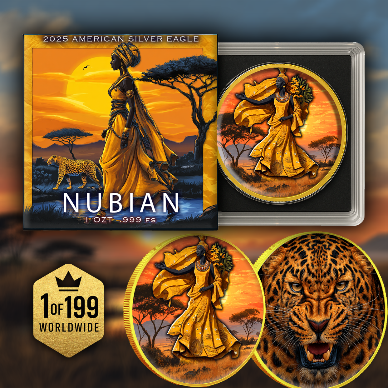 Celebrate the rich culture and vibrant wildlife of Africa with the 2025 Silver Eagle "Nubian" 1oz Colorized .999 Silver Coin.
