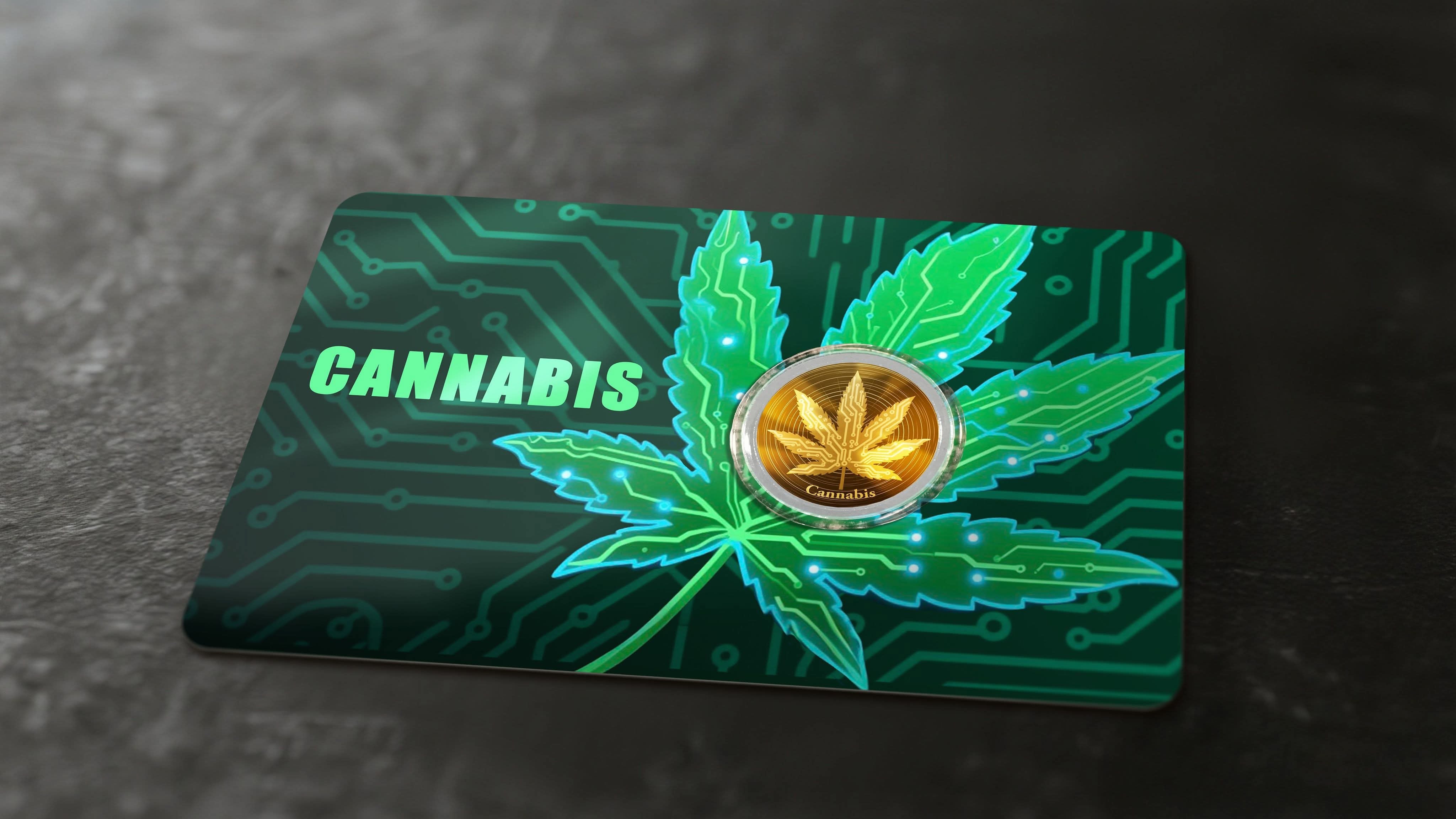 A large cannabis leaf in electric green outlined with glowing circuitry patterns symbolizing a blend of nature and technology