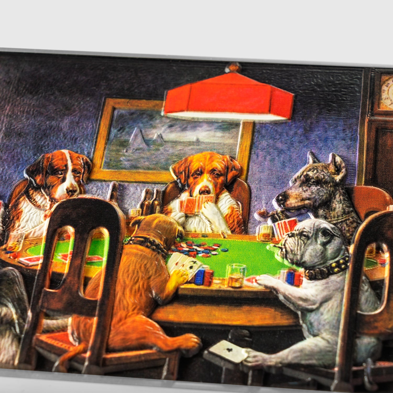 At a glance, the painting is humorous and absurd. Dogs dressed like gentlemen, puffing cigars and playing cards, is not something one expects to see on a canvas. Yet, there’s more beneath the surface. Coolidge’s work subtly mirrors human society, especially the world of masculine leisure in early 20th-century America — barrooms, games of chance, and the codes of brotherhood. The concept of “a friend in need” invokes themes of loyalty and trust, even if the act in question (cheating) is ethically questionable. This irony only enhances the painting’s appeal, encouraging the viewer to smile while also considering the nature of friendship and competition.
