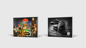 In the artwork, seven dogs – each meticulously painted with distinct expressions and personalities – gather around a poker table and are deeply engrossed in a high-stakes game. The title alludes to a quiet yet unmistakable act: one bulldog subtly passing an ace under the table to his companion, hence becoming a “friend in need.” Each dog is painted with a remarkable sense of individuality—some are focused, others anxious, and one, clearly mischievous, is executing the secret handoff. This cheeky moment of collusion lies at the heart of the scene, embodying loyalty, camaraderie, and playful mischief. Rendered in a warm and nostalgic palette to give a cozy atmosphere, the intensity of the game is juxtaposed with the lighting centered on the poker table.