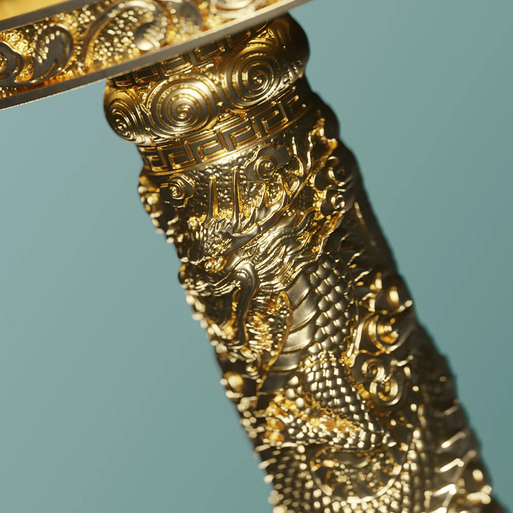 This 2 oz .999 fine silver piece by Spectres is a tribute to that storied weapon. Shaped to the profile of the Green Dragon Crescent Blade and measuring 180 x 30 mm, it features an antiqued finish with selective gold gilding applied to the blade’s mount, grip, and butt spike. Intricate detailing captures key symbolic elements: a coiled dragon etched onto both sides of the blade; swirling cloud motifs around the guard; and a textured grip wrapped in high-relief dragon scales.