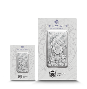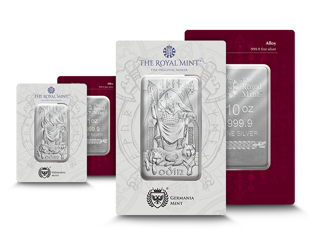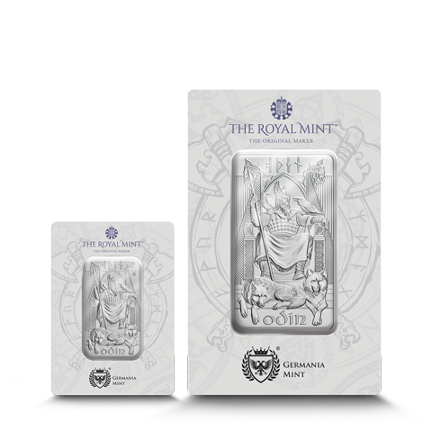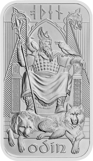 Norse Gods - Odin Silver Bar, created in collaboration between The Royal Mint and Germania Mint. This combination of the highest quality silver and unique design by The Royal Mint, enclosed in elegant packaging from Germania Mint, is a perfect choice for collectors and minting art enthusiasts.