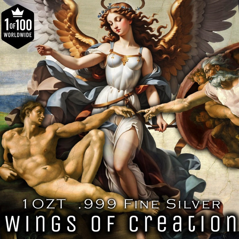 Expertly crafted and highly collectible, the 2024 Silver Eagle Colorized Wings of Creation offers a stunning portrayal of Michelangelo's famous "Creation of Adam" painting. Each 1oz .999 silver coin features vibrant colors and a limited edition of 100 pieces, making it a unique and valuable addition to any collection.