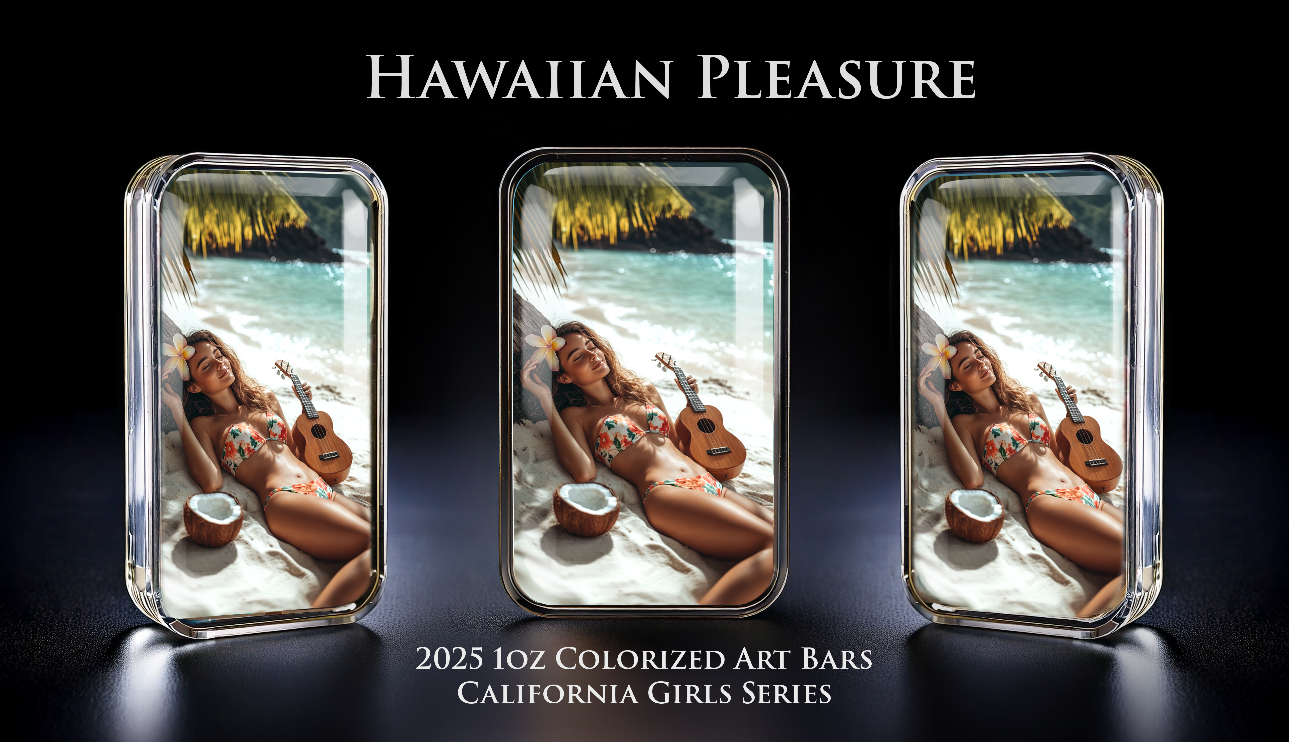 Indulge in the tropical vibes of our "Hawaiian Pleasure" 1oz .999 Fine Silver Color Art Bar from the Cali Girls Song Bar Series!