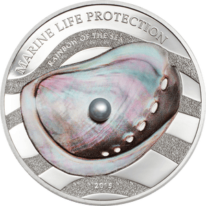Each legal-tender 2015 $5 Marine Life Protection “Rainbow of the Sea” Pearl Proof is struck in one ounce of 99.9% fine silver. It has a freshwater cultured pearl nestled in the center of the shell, which glows in a multitude of hues just like a rainbow