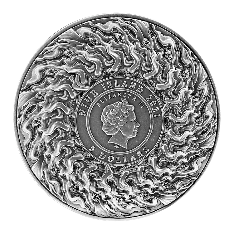 On the reverse of this artefact, the scene of Ne Zha defeating the Dragon King’s son is implanted beautifully. A careful balance of fine details result in a youthful-looking Ne Zha with delicate skin, contrasted with deep lines on his clothing as well as the dragon’s scales. The dragon struggles and arches against the Red Armillary Sash tied around him, which Ne Zha grips and controls effortlessly in one hand, the Universe Ring in the other. Being the first of his weapons, the Universe Ring is intentionally accented in gold to highlight the importance of this weapon, as well as Ne Zha’s mastery of it. The events on this face of the collectible foreshadows the appearance of the Wind-and-Fire Wheels on the obverse, where it circles around the official effigy of Queen Elizabeth II. While not existent in this part of the mythology yet, the Wind-and-Fire Wheels would eventually become Ne Zha’s most outstanding weapon; his signature in the folk tales, and thus implanted on this piece.