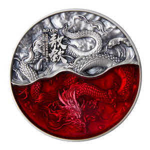 Presiding over the South China Sea is Ao Qin (敖钦), also known as the Vermillion Dragon. Ruler of the season of Spring and master of the Fire element, Ao Qin is able to command lightning and fire. The majestic creature is thus depicted diving deep in a sea of red, an allegory of his stature and powers. Above him, the waves crash and roll while he glides through the vermillion shade effortlessly. Of the four in the Dragon King series, Ao Qin is the only piece whereby his head is depicted on the enamel portion of the coin. As a result, details on his long body are clear and distinct — textured scales on the top surfacing beautifully while contrasted with a smooth underside. Straight long horns coupled with the wavy tendrils planted on the dragon’s head make his strong and dignified form stand out underneath the enamel.
