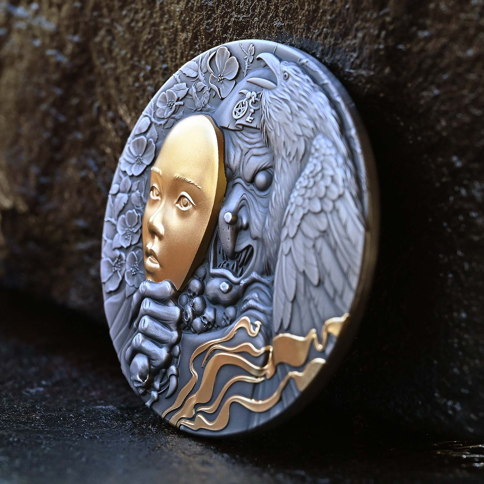 On the obverse side, the Behind the Mask Silver Coin features the face of an old woman – a symbol of those who hide their true nature and intentions.