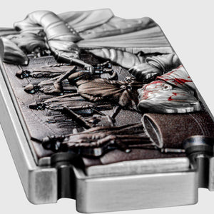A new minting technique called “Bi-Metal Max” was applied to give this piece its remarkable weight and 60x30mm in size – double the size of the regular 1 oz collectible. This is made possible by combining 2.5 oz of copper as a base with a top layer of 1 oz of 999 fine Silver, resulting in a super high relief topped with silver antiqued finishing. This razor blade-shaped collectible is a limited edition of 688 pieces only. Each piece is packaged and delivered with a Certificate verifying its edition number and authenticity.