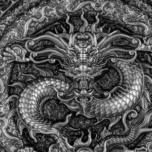 In this piece, the Chinese Dragon rises from the surface with impressive detail, a realistic image that is brought to life through a distinct 3D feel. Surrounding the legendary creature are intricate motifs of smaller dragons that lay against the mandala pattern. The pattern itself is an outstanding piece of work, its design is drawn with inspiration from the caisson ceilings of the Forbidden City. This lattice pattern was only used in important Chinese buildings such as palaces and temples due to its complexity in design and execution.