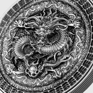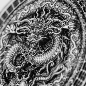 At 60mm diameter, this piece is double the size of a regular 1 oz collectible, giving it an incredible weight and feel that complements the regal Chinese Dragon. This is made possible with a new minting technique called “Bi-Metal Plus”, which combines 4.5 oz of copper embodied within two layers of 999 fine silver totaling 1 oz, to deliver a super ultra-high relief topped with silver antiqued finishing.