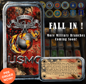 Presenting the third release in our exclusive Military Series: the United States Marine Corps (USMC) bar. This meticulously crafted piece pays homage to the brave men and women of the Marines, featuring their iconic logo and the revered "Semper Fidelis" imagery. On the reverse, the bar proudly displays the solemn oath taken by enlisted soldiers across all military branches, making it a profound tribute to our armed forces.
