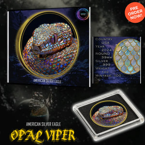 Experience the exclusive 2024 ASE Opal Viper Edition, a 1oz American Silver Eagle coin masterfully gold gilded for a striking finish. With an extremely limited mintage of only 100 coins, this rare collectible from Captain’s Chest Bullion offers both beauty and scarcity. Perfect for discerning collectors seeking a unique addition that combines iconic silver craftsmanship with luxurious gold accents. Secure this exceptional piece before it’s gone forever.