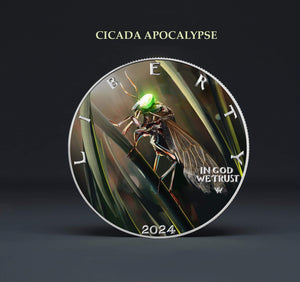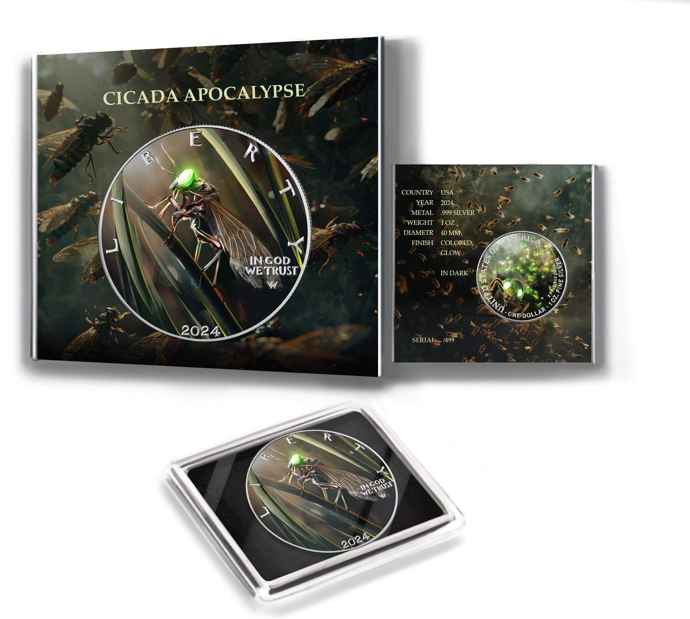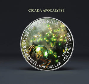 **2024 American Silver Eagle Cicada Apocalypse 1 oz Silver Colored with Glow-in-the-dark effects & comes with quadrum sleeve and COA. The low mintage celebrates 2 Cicadas coming together for the 1st time in 221 years.