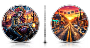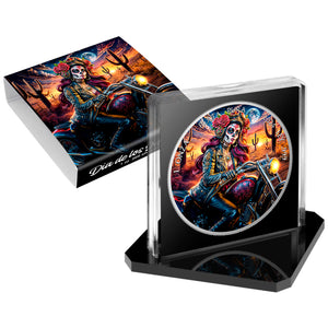 Limited edition 2024 Mexico Libertad Dia de los Muertos Biker 1oz .999 Silver Coin. Only 250 pieces available. Celebrate with this exclusive coin featuring a vibrant design and high purity silver. A must-have for any collector or investor.