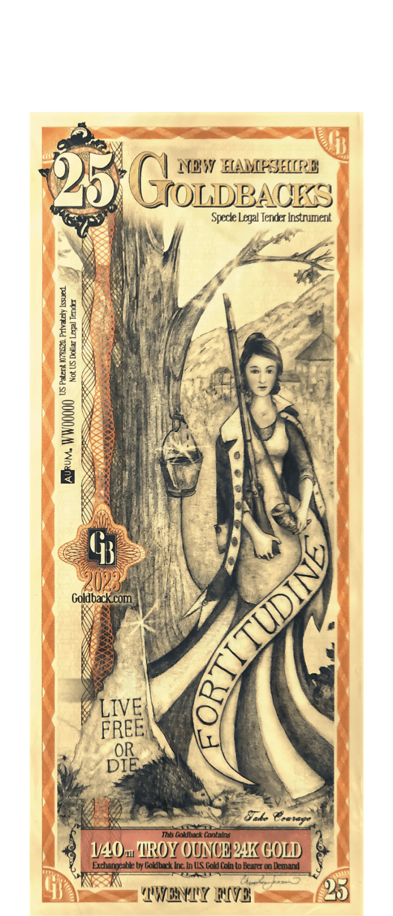 Invest in 2024 New Hampshire Goldback Foil Note 25 Dollar, containing .9999 Fine Gold. Carry and trade a piece of gold in a convenient and portable form. Secure your wealth in the face of inflation and stock market volatility. Invest in your future with this precious metal note.