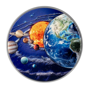 Sized at 80mm diameter, this 2 oz 999 Pure Silver coin is struck in ultra-high relief, complemented with enamel coloring and antiqued silver finishing that accentuates the lifelikeness of Solar System. This is a limited edition of 299 pieces only. Each piece is packaged and delivered with a Certificate verifying its edition number and authenticity.