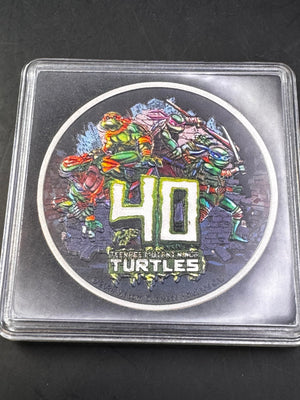 • Vibrant Imagery: The coin’s obverse is fully colorized, showcasing the iconic turtles—Raphael, Michelangelo, Leonardo, and Donatello—armed and ready for action. The number “40” is prominently featured, commemorating four decades of TMNT.
