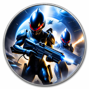The 2024 Samoa "Cosmic Invaders" Alien Battle Color Proof-like coin is a stunning addition to any collection. Struck in 1 oz of .999 silver with a diameter of 39mm, this coin showcases a vivid, futuristic design featuring two armored soldiers ready for battle against a mesmerizing cosmic backdrop of planets and stars. With an ultra-limited mintage of only 100 pieces, this collectible is as rare as it is visually striking. Presented in a space-themed protective case, it also includes detailed specifications like the year (2024) and country (USA).