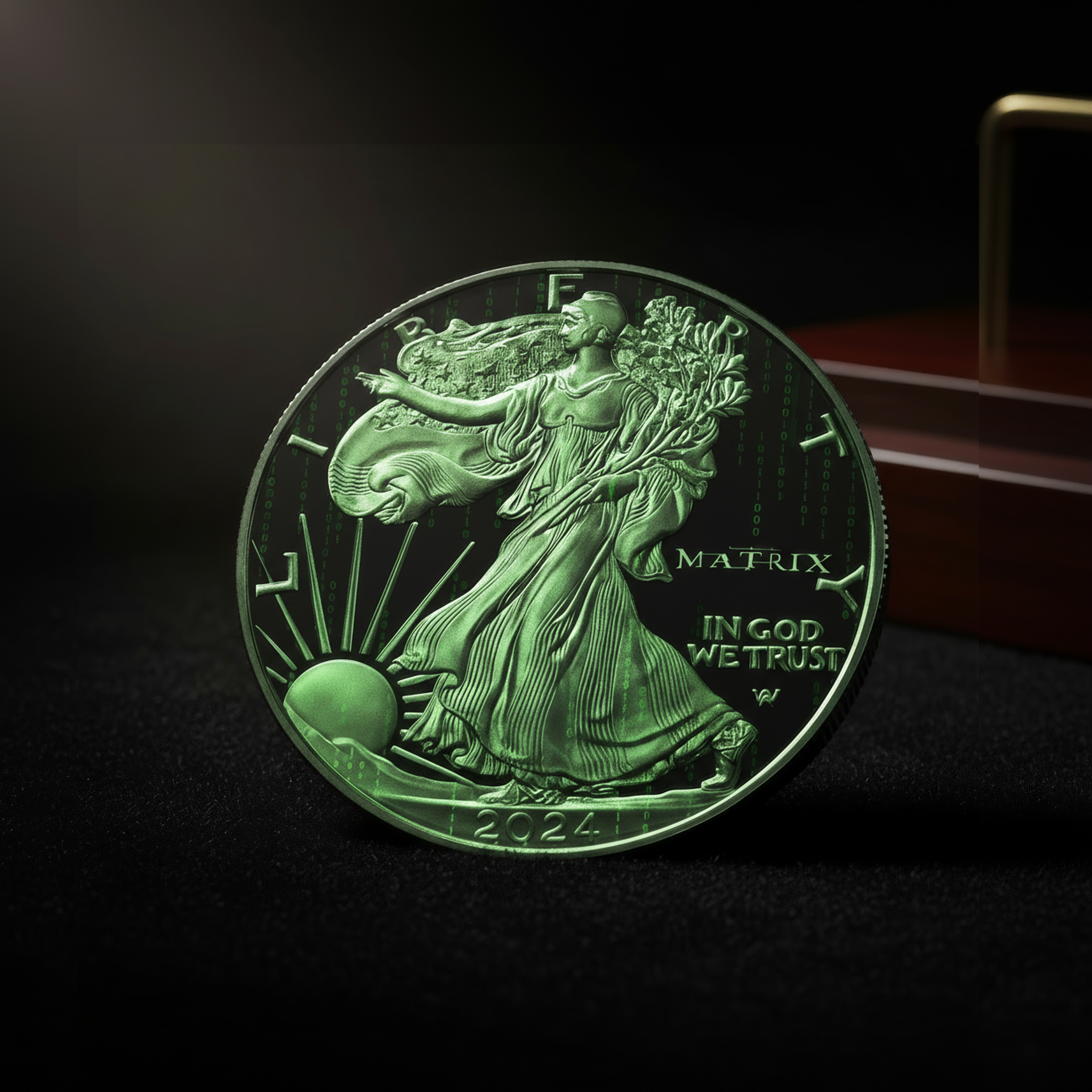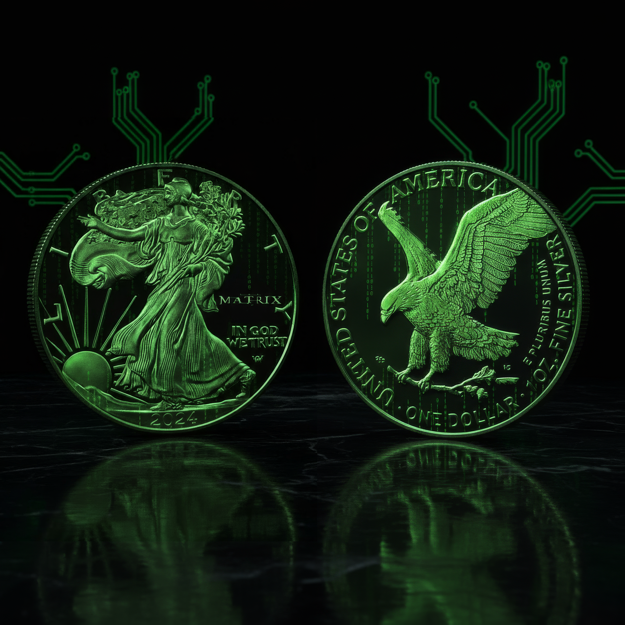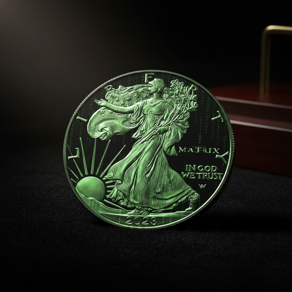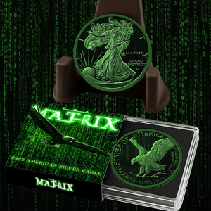 This exclusive 1oz .999 fine silver coin features a mesmerizing translucent colorized design where cascading Matrix code flows dynamically across the majestic eagle, creating a stunning visual effect that captures light and imagination.