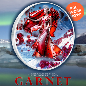Celebrate the beauty of January with our 2024 Silver Eagle Month Series Coin featuring a genuine garnet stone. Limited to only 250 pieces, this 1oz silver coin is the perfect way to commemorate the winter month. Add this unique piece to your collection and embrace the warmth of January all year round.