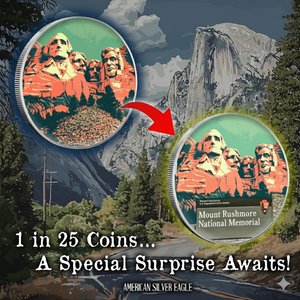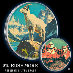 Introducing the exclusive 2024 Silver Eagle Mount Rushmore 1oz .999 Silver Coin! Adorned with a colorful Mount Rushmore photo on the eagle and a majestic mountain goat on the reverse. Only 250 pieces available! 25 lucky winners will receive the upgraded art featuring the national park sign. Don't miss out on this mystery opportunity!