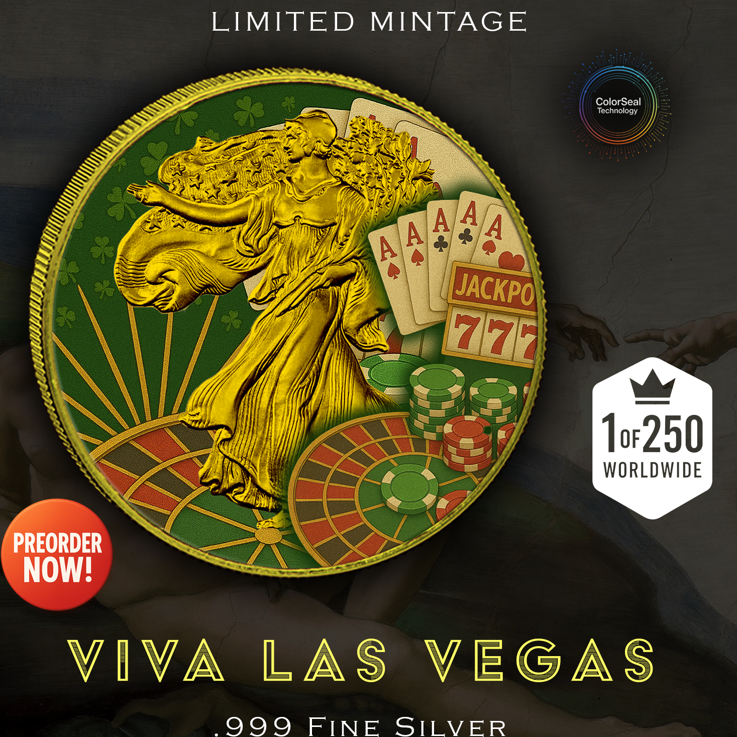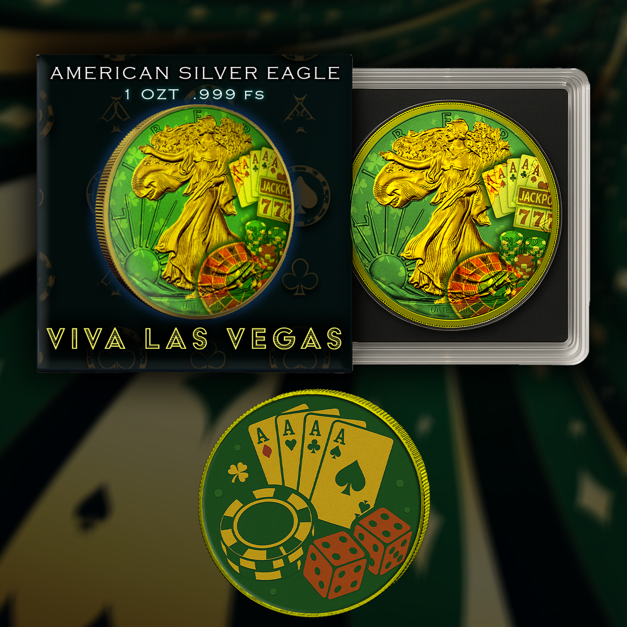 The 2024 Silver Eagle Viva Las Vegas silver coin boasts 250 PIECES, including a stunning gold gilded design and motifs of gambling and night lights. Indulge in the glitz and glamour of Sin City with this 1oz .999 pure silver coin.