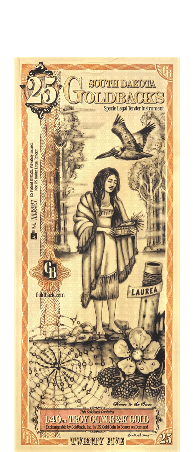 Invest in 2024 South Dakota Goldback Foil Note 25 Dollar, containing .9999 Fine Gold. Carry and trade a piece of gold in a convenient and portable form. Secure your wealth in the face of inflation and stock market volatility. Invest in your future with this precious metal note.