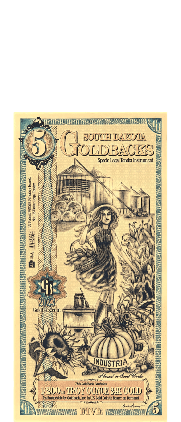 Invest in 2024 South Dakota Goldback Foil Note 5 Dollar, containing .9999 Fine Gold. Carry and trade a piece of gold in a convenient and portable form. Secure your wealth in the face of inflation and stock market volatility. Invest in your future with this precious metal note.