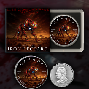 The 2025 Canada Maple Iron Leopard 1oz .9999 Silver is a limited edition collector's item featuring the iconic Maple Leaf design. Crafted from 1 oz of pure silver, it is one of the Iron Big Five coins and has a worldwide production of only 100 pieces. Add this unique and valuable coin to your collection today.