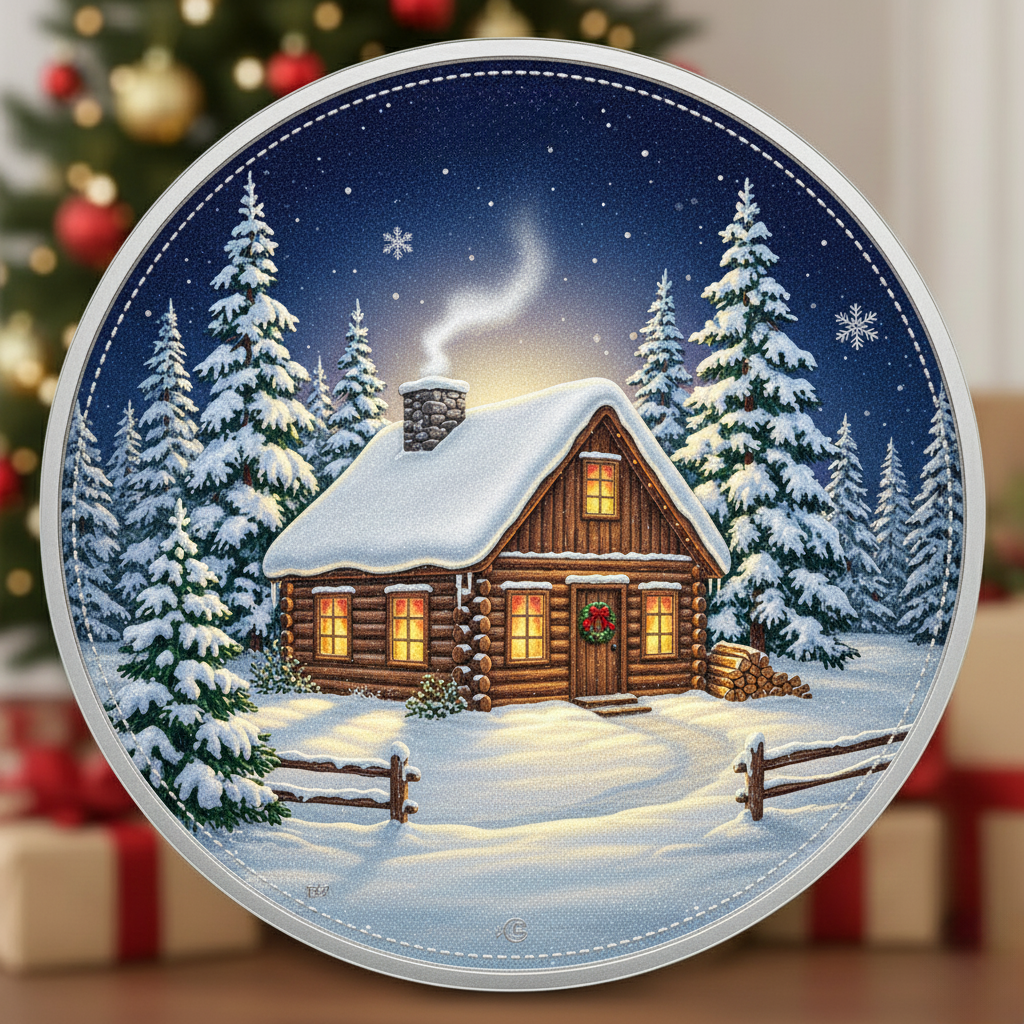 Each 1oz .9999 pure silver piece features exquisite dual imagery: a charming gingerbread house adorned with holly and festive reds and greens on the obverse, while the reverse showcases a snow-blanketed cabin with glowing windows and a roaring fireplace—capturing the warmth and wonder of the season.
