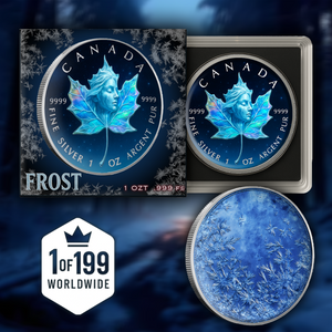 Experience the rare beauty of the 2025 Canada Maple Frost Edition 1oz .9999 Silver Colorized Coin.