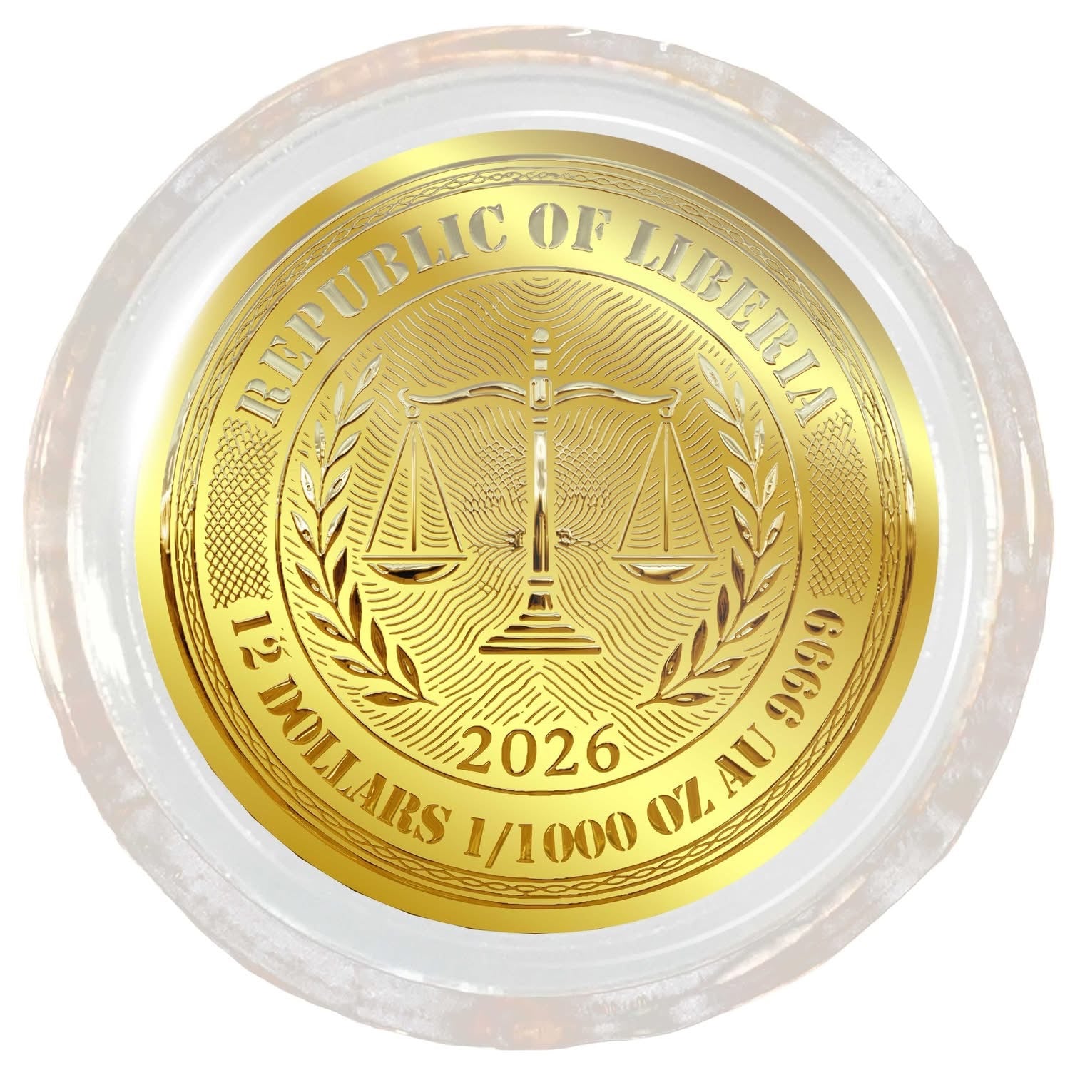 This 2025 Liberia USA gold coin boasts a dazzling proof-like finish with intricate laser detail, capturing exquisite craftsmanship in just 12 mm diameter.