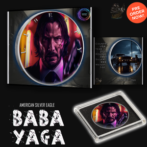 Own a piece of cinematic history with the 2025 Silver Eagle Baba Yaga Edition 1oz .999 Silver Coin! Featuring John Wick, his iconic car, and beloved dog, this colorized coin is a must-have for any fan. Limited mintage of only 250, so get yours before they're gone!