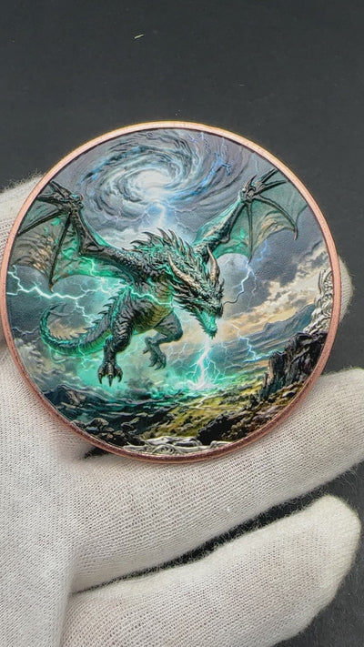 Witness the majesty of the Dragons in Flight—a stunning 5oz pure copper collectible struck in colorized high relief.