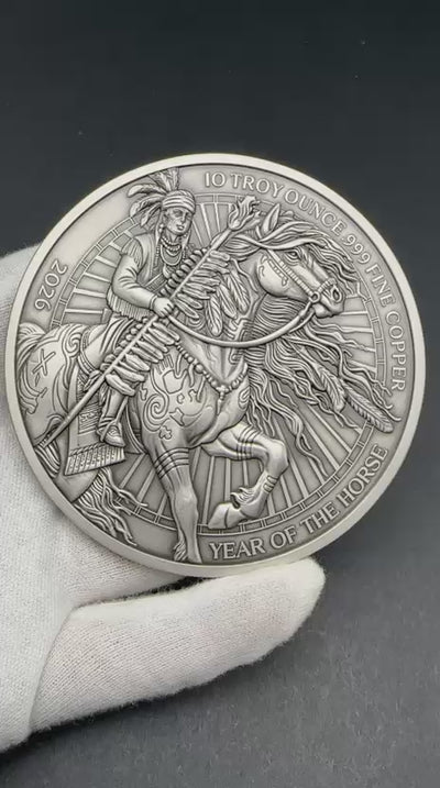 2026 Image Improvement Year of the War Horse 10oz Large Diameter .999 Copper with Antique Silver Finish - Captain’s Chest Bullion