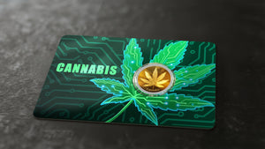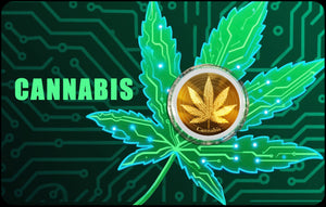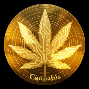 A large cannabis leaf in electric green outlined with glowing circuitry patterns symbolizing a blend of nature and technology