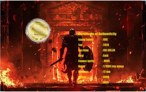 Introducing the second installment in Niue's captivating Greek Mythology series—the 2026 Ares coin. This exquisite .9999 pure gold piece features a 12mm design and weighs 1/1000 troy ounce, making it an elegant addition to any precious metals collection. With a face value of 50 cents and a limited mintage of just 9,999, this coin combines numismatic rarity with investment-grade gold purity. Each coin arrives beautifully presented in protective card packaging, ready for display or safekeeping. Perfect for mythology enthusiasts and gold collectors alike.