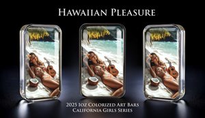 Indulge in the tropical vibes of our "Hawaiian Pleasure" 1oz .999 Fine Silver Color Art Bar from the Cali Girls Song Bar Series!
