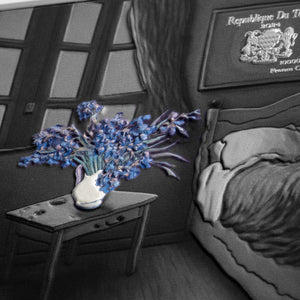 The painting centres a bed of Irises in various shades of blue, purple, and green. Van Gogh employed bold, contrasting hues to create a sense of abundance and vitality, reflecting his fascination with nature and his ability to infuse his paintings with emotional resonance. The brushwork on each iris showcase their intricate and delicate petals, highlighting van Gogh’s unique ability to capture the essence of nature while infusing his work with his own emotional depth.