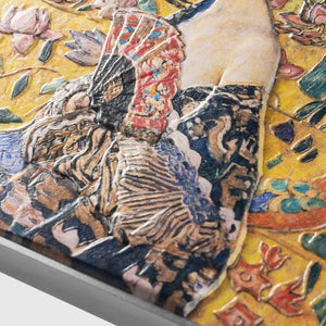 The exquisite artwork Dame mit Facher (Lady with a Fan) was a creation of Gustav Klimt, an Austrian symbolist painter. Similar to many of his other paintings, the intricate patterns, bold colours and suggestive imagery used in Klimt’s works continue to captivate audiences today.