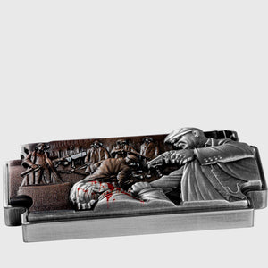 A new minting technique called “Bi-Metal Max” was applied to give this piece its remarkable weight and 60x30mm in size  – double the size of the regular 1 oz collectible. This is made possible by combining 2.5 oz of copper as a base with a top layer of 1 oz of 999 fine Silver, resulting in a super high relief topped with silver antiqued finishing. This razor blade-shaped collectible is a limited edition of 688 pieces only. Each piece is packaged and delivered with a Certificate verifying its edition number and authenticity.