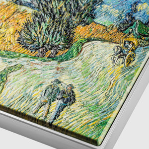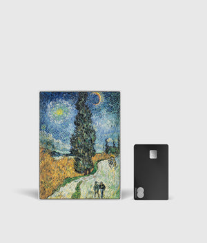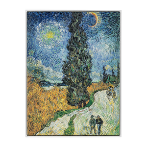 The painting depicts a rural scene at night, dominated by a tree-lined path that winds into the distance. Imbued with a scenes of serenity and solitude, the night sky conveys tranquility while the trees and the road evokes a scenes of mystery and contemplation. The cypresses in this painting also hold a deeper significance to Van Gogh as they are deep sources of inspiration and emotional resonance to the artist. The trees’ forms of reaching upward into the luminous night sky conveys a sense of longing and a quest for a higher understanding, a theme that resonates with the artist’s own spiritual explorations.